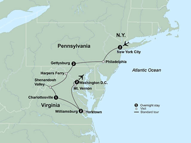 Follow the epic story of American democracy. Spend two nights in New York City before heading to Philadelphia to view the Liberty Bell and see Independence Hall. Walk the hallowed battlefield at Gettysburg and tour the National Military Park & Museum. Enjoy a choice between visiting President Eisenhower’s home (a National Historic Site) or a walking tour of historic downtown Gettysburg. Stop in quaint Harper’s Ferry, then travel along the famous Skyline drive for amazing views of the Shenandoah Valley. Visit the presidential estates of Washington’s Mount Vernon and Jefferson’s Monticello. Tour some of Colonial Williamsburg’s 88 restored historic buildings and dine in a traditional tavern. Learn about the American Revolution at Yorktown and explore the outdoor living history museum, including a re-created Continental Army encampment and Revolution-era farm. Explore the countless treasures of the Smithsonian Institution with your choice of visiting the National Air and Space Museum or the National Museum of American History. Tour Washington, D.C.’s National Mall and view the moving World War II Memorial, the Vietnam Veterans Memorial and the Korean War Memorial. Visit Arlington National Cemetery.