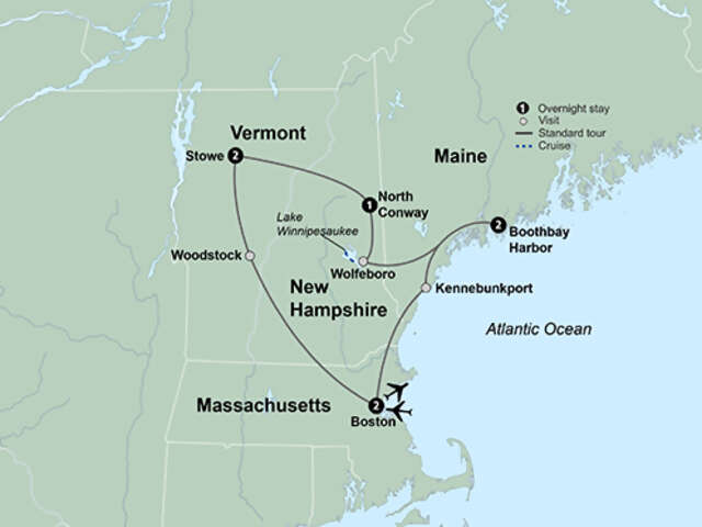 Be charmed by the colors of New England on this tour that brings you from the heart of historic Boston to the farms, coast and mountains of the north. Tour historic Boston during a 2-night stay in the heart of the city. Explore Woodstock, Vermont, a quintessential New England village. Tour Ben & Jerry’s Ice Cream Factory and sample some of its delicious creations. Watch apples transform into cider before your eyes at Cold Hollow Cider Mill. Learn about the maple sugaring industry of New England on a farm tour of the Rocks Estate. Relax as your cruise along Lake Winnipesaukee, admiring the splendid views. Dig in at a traditional New England lobster dinner. Admire Maine’s dramatic coast and discover the seaside communities of Boothbay Harbor and Kennebunkport. This is New England at its finest.