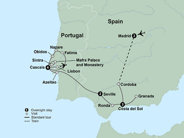 Enjoy a true taste of the Iberian Peninsula. In Madrid, Spain, you choose your experience: a city tour and tour of the renowned Prado Museum with a local expert, or a walking tour of the city’s Hapsburg-era architectural treasures. Travel via high-speed train to the Moorish city of Cordoba. Relax in Malaga’s parador on the Costa del Sol. Tour Granada’s Alhambra Palace. Marvel at the architecture of the Cathedral of Seville, third largest in the world. Visit Ronda, an architectural marvel, in Andalucía. Choose from a panoramic tour of Lisbon with a visit to the coach museum or a walking tour of the Moorish Alfama Quarter with a visit to Sao Jorge castle. Enjoy a 4-night stay on Portugal’s Riviera. Visit the Mafra Palace and Monastery, one of the most impressive Baroque buildings in Portugal. Travel the Silver Coast and visit Fatima, the world-famous pilgrimage site. Enjoy leisure time for independent explorations.