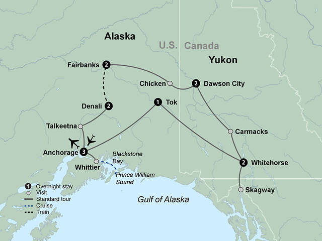 Come to know all of the treasures of “the last frontier” – unspoiled landscapes, ancient glaciers, and an array of wildlife. Take a trip through breathtaking Prince William Sound to view its glaciers. Visit the small town of Tok, the original trade center for travelers coming from and returning to Canada. Set out for the “Gateway of the Klondike” – Skagway. Board a scenic sternwheeler for a cruise on the peaceful Chena River. Enjoy breakfast and savor first-class Goldstar service on the Alaska Railroad on an adventure into Denali National Park, and travel deep into the park on a backcountry adventure Tundra Wilderness tour. Enjoy some leisure time in the quaint town of Talkeetna. This is the best of Alaska and the Yukon.