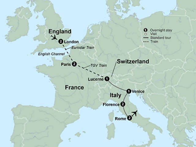 Get ready to embark on the European journey of a lifetime! See the incredible sites of London, from Buckingham Palace to Big Ben. Take the Eurostar train to Paris – the “City of Lights,” and enjoy a full day on your own to explore before taking in breathtaking views from your dinner table at the Eiffel Tower. Board a high speed train bound for Lucerne, the enchanting Swiss city on a cobalt lake and one of Switzerland’s most beautiful places. In Venice, discover a floating city where iconic landmarks of centuries-old history line canals dotted with gondolas. Tour Florence, the “Cradle of the Renaissance,” and make a special visit to David – Michelangelo’s masterpiece. Finally, in Rome, bask in cultural treasures and envelop yourself in history, which includes a visit to the mythic Colosseum.