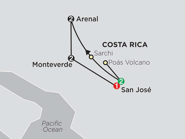 A beautiful cloud forest, the world’s largest active volcano crater, national parks teeming with life, relaxing thermal hot springs—these are just some of the places waiting for you on this Costa Rica tour. You’ll overnight in San José, Arenal, and Monteverde. You’ll get up close to nature on this Costa Rica tour. A highlight is a walk with a knowledgeable Naturalist in the Monteverde Cloud Forest Reserve. The Monteverde Cloud Forest Reserve is home to over 400 bird species, 120 mammal species, 120 species of amphibians and reptiles, more than 3,000 plant species, and one-third of the population of orchids. On your guided walk, have your camera ready to capture this forest’s impressive beauty and the species that call this area home. Another highlight of this Costa Rica tour is your time spent at the Arenal Hanging Bridges. Accompanied by an expert Naturalist, take to the treetops for a 360-degree bird’s-eye view of the tropical rainforest from the 15 hanging bridges suspended in the rainforest canopy. In the Arenal Volcano area, you’ll also have the chance to relax in the thermal, healing waters at Tabacon Hot Springs, heated by the magma found in the earth’s core. Near San José, you’ll visit Doka Estate, one of Costa Rica’s premium coffee plantations, and Poás Volcano, the largest active crater in the world with frequent geyser-like eruptions. Here, a walk along the trails leads you through cloud forests filled with stunted and twisted vegetation from the volcanic emissions and cold, windy, high-altitude habitat. For value-minded travelers looking to experience nature at its finest, this Costa Rica tour is an experience not to be missed!