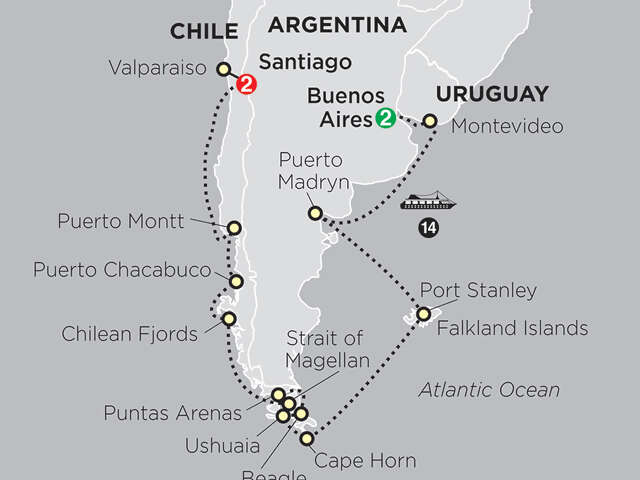 Embark on a South America exploration with a two-week cruise! You’ll board your cruise ship after two nights in the exciting city of Buenos Aires, to travel by sea to visit some of the continent’s most remarkable locales. Your ports of call include destinations in Uruguay, Argentina, Chile, and the Falkland Islands. Witness the wildlife of the gateway to remote environments and Argentine Patagonia; see stunning landscapes of the Falklands with penguins on shore of the coastal town of Port Stanley; and cruise around Cape Horn at the end of the world—where the Atlantic and Pacific Oceans meet. Other once-in-a-lifetime adventures include your journey to Tierra del Fuego and the Beagle Channel—named after the first ship to explore the region. You’ll cruise the Strait of Magellan and through the Chilean fjords, passing icebergs, glaciers, and Andean peaks. Your odyssey carries you to Patagonia’s Lake District with some of the Earth’s most breathtaking scenery. Your affordable South America vacation concludes in sophisticated Santiago to enjoy the vibrant city at cruise’s end.