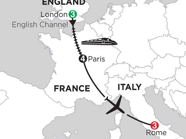 Travel by high-speed Eurostar train (Standard class) London-Paris with porterage; transfers to/from train stations; by air on selected flights Paris-Rome with transfers