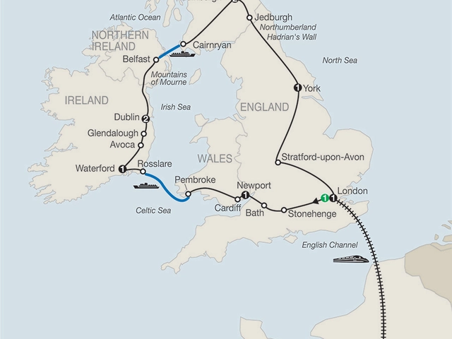 STONEHENGE Visit the prehistoric monumentBATH Visit the Roman relicsNEWPORT Welcome dinnerCARDIFF Orientation drive, guided tour of Cardiff CastlePEMBROKE–ROSSLARE Cross St. George’s Channel by ferryWATERFORD [LF] Enjoy a traditional Irish coffee; guided tour of the House of Waterford CrystalAVOCA [LF] Guided tour of the handweaving millGLENDALOUGH Guided tour of St. Kevin’s center of Irish ChristianityDUBLIN Orientation driveBELFASTOrientationBELFAST–CAIRNRYAN Cross the North Channel by ferryEDINBURGH Guided sightseeing, visit Edinburgh CastleJEDBURGH Take pictures of the abbey ruinsYORK Walking tourSTRATFORD-UPON-AVON Take pictures of Anne Hathaway’s Cottage, visit Shakespeare’s birthplace and [LF] enjoy lunchLONDON-PARIS By high-speed Eurostar TrainPARIS Guided sightseeing, visit the Notre Dame Cathedral and The Louvre