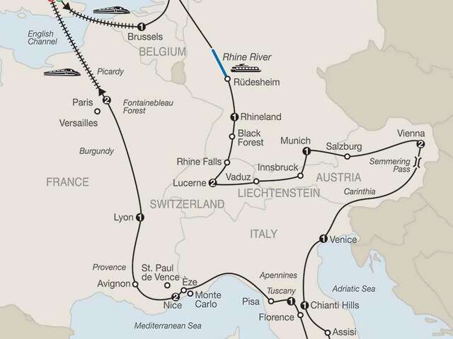 LONDON Guided sightseeing, visit St. Paul’s Cathedral and see the Changing of the Guard, if heldLONDON–BRUSSELS By high-speed Eurostar trainBRUSSELS Visit Grand’Place; [LF] enjoy a beer at a local café; welcome dinnerAMSTERDAM Canal cruise; visit a major diamond centerRHINE CRUISERÜDESHIEM [LF] Wine tasting and dinnerBLACK FOREST Hear about the art of woodcarvingRHINE FALLSLUCERNE Walking tour including the Lion Monument & Chapel BridgeVADUZ Visit the capital of LiechtensteinINNSBRUCK Walk to the Golden RoofMUNICH Orientation drive featuring the Olympic Stadium and a visit to MarienplatzSALZBURG Guided walking tour, visit Mirabell Gardens and Residenz Square VIENNAGuided sightseeing, visit St. Stephen’s CathedralVENICE Private boat ride; guided walking tour, visit St. Mark’s Square and Basilica, Doges’ Palace and the Bridge of Sighs; glassblower demonstration CHIANTI HILLS[LF] Overnight stay, a special dinner with wineASSISI Visit St. Francis’ BasilicaROMEGuided sightseeing, visit the Vatican Museums and Sistine Chapel, St. Peter’s Square and Basilica, and the ColosseumFLORENCEGuided walking tour, visit Michelangelo’s David and Signoria Square PISAMarvel at the legendary Leaning TowerÈZE Visit a perfume factoryAVIGNON Walk through the Old Town, see the Palace of the PopesLYON Orientation drive through the Old Town, see the Murales PARIS Guided sightseeing, LF] Seiine River cruise; a special farewell dinner at a local restaurant; and ascend the Eiffel TowerPARIS-LONDON By high-speed Eurostar TrainHeadsets throughout the tour