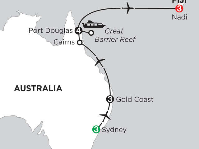 Sun and fun down under…sounds like bliss, doesn’t it? And no one brings you sun and fun like Monograms! On this 14-day vacation, we’ve arranged your hotel reservations, sightseeing, daily breakfast, and transfers from/to your hotels to/from the airports for your intra-vacation flights. Plus, you’ll have a Monograms Local Host ®—someone who knows the ins and outs and is there to ensure your vacation goes smoothly—to answer your questions, arrange optional activities, and offer suggestions for shopping and dining.Your vacation begins the moment you arrive in Sydney, where we can seamlessly whisk you from the airport to your selected hotel. Your guided sightseeing in Sydney with a local expert includes photo stops at the world-famous Opera House and Sydney Harbour Bridge. You’ll also have a full day to explore Sydney on your own (with the support of your Local Host of course). You may want to climb to the top of Sydney Harbour Bridge for amazing views; explore the cobblestone streets at the Rocks, the harborside area where the first convicts settled; or visit Hunter Valley to sample Australia wines.Then, we’ll take you to the airport so you can fly to the Gold Coast, a tropical paradise known for its white-sand beaches. From the Gold Coast, you’ll take an included excursion to Mount Tamborine National Park, where a guided rainforest walk takes you to a tropical waterfall. Keep your eyes open for native wildlife. Monograms has also arranged a local wine tasting and a visit to the Gallery Walk, where local artists showcase their works. In your free time at the Gold Coast, you may want to soak in the sun on the white-sand beach, visit Currumbin Wildlife Sanctuary to feed a kangaroo or cuddle a koala, or enjoy the Gold Coast’s thriving food scene. You’ll then fly to Cairns and be transported to Port Douglas, a beachside town surrounded by rainforest and the Coral Sea. Here, you’ll have the experience of a lifetime when you board a catamaran and cruise to the Great Barrier Reef, one of the Seven Natural Wonders of the World. You can choose to snorkel, take a semi-submersible watercraft tour, or attend a presentation by a marine biologist. This underwater world, with its brilliant colors and fish swimming around you, is nothing short of spectacular! With your two full days of leisure in Port Douglas, you may want to stroll on Four Mile Beach, browse the shops in downtown Port Douglas, or visit the Daintree Forest, the world’s oldest living rainforest. Even more sun and fun await you in Fiji, where you’ll end this marvelous vacation with three nights in tropical paradise. Your included sightseeing tour takes you to the Garden of the Sleeping Giant, Viseisei Village, Namaka Market, and more. In your free time, you may want to play golf, lounge by the pool, or enjoy a spa service. With the time and hassles you save by letting Monograms take care of the details, all you have to do is enjoy this Australia and Fiji vacation filled with fun and sun!