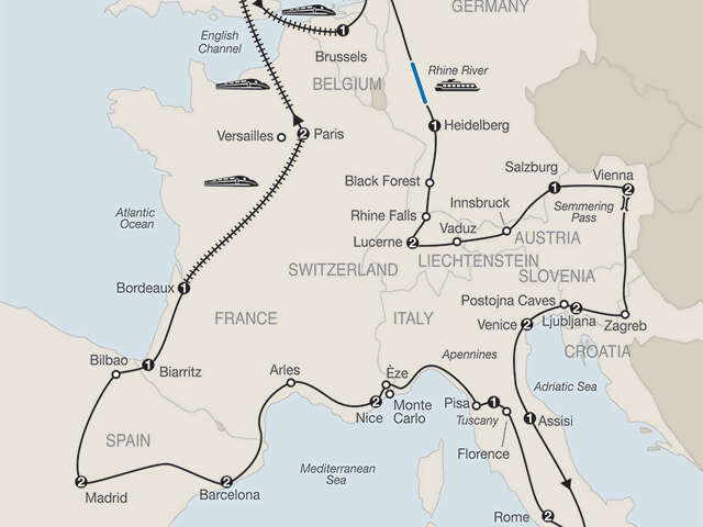 LONDONGuided sightseeing, visit St. Paul’s CathedralLONDON–BRUSSELS By high-speed Eurostar trainBRUSSELS Visit Grand’Place; [LF] enjoy a waffle and beer tasting at a local café; welcome dinnerAMSTERDAM Canal cruise; diamond centerRHINE CRUISE; HEIDELBERGTake pictures of the castleBLACK FOREST Hear about the art of woodcarving; RHINE FALLSLUCERNEWalking tour including the Lion Monument and Chapel BridgeVADUZ Visit the capital of LiechtensteinINNSBRUCK Walk to the Golden Roof SALZBURG[LF] A special dinner at Farmhouse Lenzenbauer; guided walking tour, visit Mirabell Gardens and Residenz Square VIENNAGuided sightseeing, visit Heldenplatz and Cathedral Square; admire the unusual Hundertwasserhaus ZAGREBGuided sightseeing; visit the cathedralLJUBLJANAGuided sightseeing, visit St. Nicholas’ Cathedral POSTOJNA[LF] Visit the Postojna Caves by mini-trainVENICEPrivate boat ride; guided walking tour, visit St. Mark’s Square & Basilica, Doges’ Palace and the Bridge of Sighs; glassblower demonstrationASSISIVisit St. Francis’ Basilica SORRENTO[LF] Excursion along the Amalfi Coast to Positano, taste a glass of Limoncello; excursion to Capri, including jetfoil boatride, funicular ride, and guided sightseeing POMPEIIGuided walking tour of the excavations ROME Guided sightseeing, visit the Vatican Museums and Sistine Chapel, St. Peter’s Square and Basilica, the Colosseum and Roman Forum FLORENCEGuided walking tour, visit Signoria Square; see Ponte Vecchio PISAMarvel at the legendary Leaning Tower ÈZEVisit a perfume factory ARLES Walk to the Roman AmphitheaterBARCELONAGuided sightseeing, visit the gothic quarter; take pictures of the Sagrada Familia Basilica MADRIDGuided sightseeing, visit the Prado Museum BILBAOVisit the Guggenheim MuseumBIARRITZOrientation BORDEAUXOrientation drive BORDEAUX–PARISBy high-speed TGV train (first-class) PARISGuided sightseeing, ascend the Eiffel Tower, [LF] farewell dinner at a local restaurant, followed by a drive through the “City of Light”PARIS–LONDONBy high-speed Eurostar TrainHeadsets throughout the tour