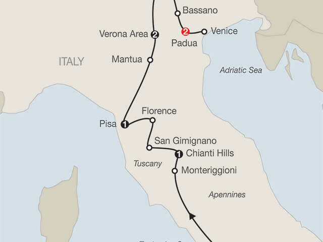 ROMEWelcome dinner at a local restaurant; guided sightseeing, visit the Colosseum and Roman Forum, the Vatican Museums and Sistine Chapel, St. Peter’s Square and BasilicaMONTERIGGIONI[LF] Visit the medieval walled town and taste cantucci alle mandorleSAN GIMIGNANOWalking tourFLORENCEGuided walking tour, visit Michelangelo’s David and Signoria SquarePISAMarvel at the legendary Leaning TowerMANTUA Guided sightseeing, visit Teatro BibienaVERONA Walking tour including Juliet’s balcony and the ArenaTRENTO OrientationBASSANO[LF] Taste the local grappa at the Poli Museo della Grappa PADUA OrientationVENICEPrivate boat ride; guided walking tour, visit St. Mark’s Square and Basilica, Doges’ Palace and the Bridge of Sighs; glassblower demonstration; [LF] farewell dinner at Al Colombo restaurant and a ride by private taxi boat through the Grand CanalHeadsets throughout the tour