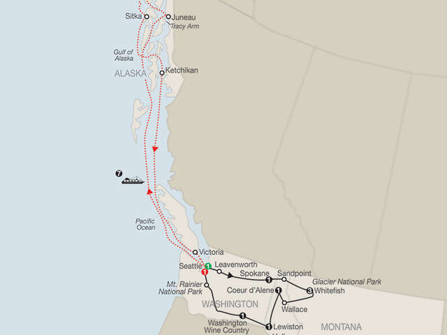 SEATTLEFarewell dinnerSPOKANESightseeingGLACIER NATIONAL PARKTravel along Going-to-the-Sun Road in Red Jammer busesWHITEFISH[LF] Western ranch BBQ dinner with sing-along; visit the Conrad Mansion; gondola rideWALLACEGuided tour of a silver mineCOEUR D’ALENESightseeing cruiseHELLS CANYONScenic cruise and [LF] BBQ lunchLEWISTONNez Perce National Historic Park, visit [LF]Pataha WASHINGTON WINE COUNTRY[LF] Winery tour & tastingMOUNT RAINIER NATIONAL PARKSightseeingCRUISE 7-night cruise aboard Holland America’s MS Westerdam