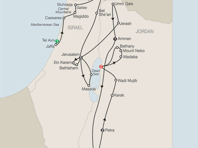TEL AVIVWelcome dinnerJAFFAWalking tour of the ancient portCAESAREAVisit the Roman amphitheater and the Crusader fortressMEGIDDOVisit the biblical siteMUHRAQAPanoramic view of the Jezreel ValleyCANAVisit the site of the first miracleNAZARETHVisit the Church of the Annunciation and St. Joseph’s ChurchSEA OF GALILEEEnjoy a cruiseMOUNT OF BEATITUDESVisit the site where Jesus delivered his sermonTABGHAVisit the Church of the Multiplication of Loaves and Fishes and the Church of St. Peter’s PrimacyCAPERNAUMVisit the site where Jesus recruited his first followersRIVER JORDANVisit a baptismal siteBET SHE’ANAdmire the Roman and Byzantine relicsEIN KAREMVisit the Church of St. John the Baptist and the Church of VisitationBETHLEHEMVisit the Church of the NativityJERUSALEMVisit the Garden Tomb; panoramic view from the Mount of Olives; guided walking tour, visit the Garden of Gethsemane, follow the Way of the Cross along the Via Dolorosa; visit the Church of the Holy sepulchre, the Wailing Wall, and walk through the Jewish Quarter to Mount Zion, visit the Upper Room, the tomb of King David, and the house of Caiaphas; farewell dinnerMASADARide a cable car and visit the cliff-top fortressDEAD SEAVisit one of the resortsJERASHOrientationUM QUAISStop at the site of the Gadarene swine miracleWADI RUMVisit the largest wadi in Jordan; four-wheel-drive through the sand dunesPETRAGuided sightseeing, including the Siq and the Treasury; sip tea in a Bedouin tentKERAKVisit the Crusader CastleWADI MUJIBVisit the Jordanian Grand CanyonMADABAVisit St. George’s Church and the Archaeological MuseumMOUNT NEBOVisit the mountain where Moses saw the Promised LandBETHANY BEYOND THE JORDANVisit the site of John the Baptist’s settlementHeadsets throughout the tour (except in Jordan for technical reasons)