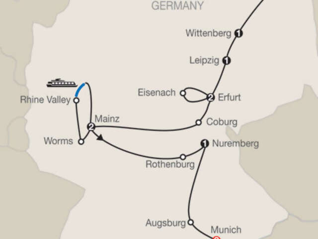 BERLINWelcome dinner with wine; guided sightseeing, visit Kaiser Wilhelm Memorial ChurchWITTENBERGGuided walking tour, visit Luther House and Museum and Melanchthon HouseLEIPZIGWalking tour, visit the Thomaskirche and the market squareEISLEBENOrientation, visit Luther’s Birthplace Museum and Death House Museum, St. Andrew and St. Peter & Paul ChurchesERFURTVisit the Augustinian Monastery and the Merchants’ BridgeEISENACHGuided visit of Wartburg Castle; see the Luther and Bach Memorials, Nikolai Gate, and visit Nikolai ChurchCOBURGVisit Coburg FortressWORMSVisit the cathedral, Trinity Church, and the Reformation MonumentRHINE CRUISEMAINZ Visit the Gutenberg MuseumROTHENBURGWalking tour, visit St. Jacob’s ChurchNUREMBERG Walking tour, visit the St. Lorenz Lutheran ChurchAUGSBURG Guided sightseeingMUNICHGuided sightseeing, visit Marienplatz; farewell dinner with wineHeadsets throughout the tour