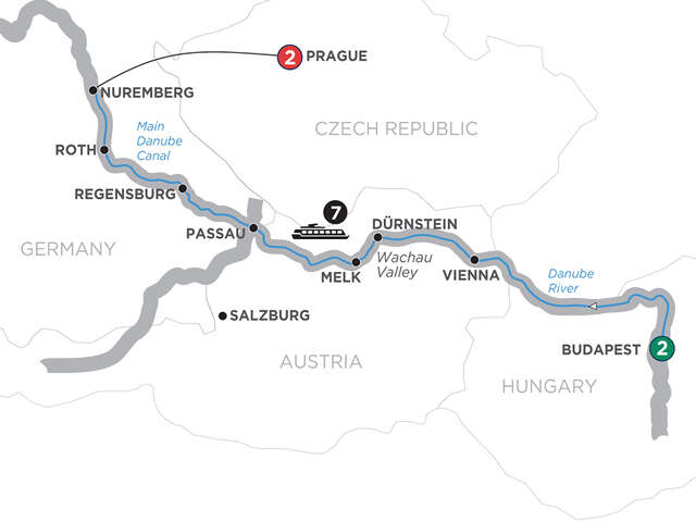 Day 1 Budapest: welcome to Budapest! Day 2 Budapest: guided tour, see Heroes’ Square and visit a wine cellarDay 3 Budapest (Embarkation): onboard welcome receptionDay 4 Budapest–Vienna: cruising; onboard wine lectureDay 5 Vienna: guided sightseeingDay 6 Dürnstein–Wachau Valley: choice of guided tour, or hike up to the castle ruins in Dürnstein, or visit a local wine cellar; scenic cruise through the Wachau Valley; wine tasting on boardDay 7 Passau: guided walk; onboard food & wine pairing dinnerDay 8 Regensburg: guided walkDay 9 Nuremberg: onboard wine lecture; choice of guided sightseeing, or Rally Grounds in Nuremberg, or Roth guided tourDay 10 Nuremberg (Disembarkation)–Prague: travel to PragueDays 11 Prague. Excursion to Melnik: guided sightseeing, see the Astronomical Clock and visit Hradčany Castle grounds; excursion to Melnik wine areaDay 12 Prague: your vacation ends this morning