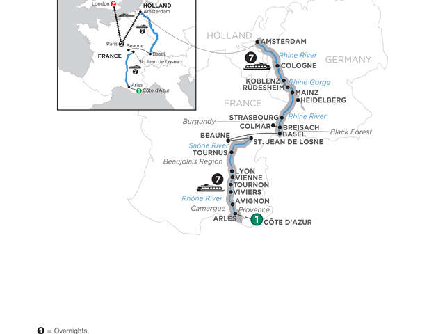 Day 1 Côte d’Azur: welcome to FranceDay 2 Côte d’Azur–Transfer to Arles (Embarkation): onboard welcome reception; scenic cruising in the Camargue region (daylight permitting)Day 3 Arles: guided sightseeing, visit the Roman AmphitheatreDay 4 Avignon: guided sightseeing, visit Palace of the Popes; guided tour to Châteauneuf du PapeDay 5 Cruising–Viviers: onboard lecture; guided walk, visit the Old Town and the cathedralDay 6 Tournon/Tain l’Hermitage–Vienne: guided walk in Tournon; onboard chocolate and wine tasting; guided walk in Vienne; onboard food & wine pairing dinnerDay 7 Lyon: guided sightseeing, picture stop on Fourvière Hill; guided tour to BeaujolaisDay 8 Cruising–St. Jean de Losne: Chardonnay excursion; wine & cheese tasting on boardDay 9 St. Jean de Losne (Disembarkation)–Beaune–Basel (Embarkation): choice of visit the Hôtel-Dieu in Beaune, or visit a wine cellar; transfer to the shipDay 10 Breisach. Excursion to Black Forest: choice of excursion to Black Forest, or guided tour in ColmarDay 11 Strasbourg: guided sightseeing, visit La Petite France district and the gothic cathedralDay 12 Excursion to Heidelberg. Mainz: guided tour of Heidelberg Castle, see the Great Vat; visit the Gutenberg Museum in MainzDay 13 Rüdesheim–Rhine Gorge–Koblenz: visit Siegfried’s Mechanical Musical Instrument Museum in Rüdesheim; special treat; scenic cruise through the Rhine Gorge; guided walk in KoblenzDay 14 Cologne: choice of “Cologne Highlights” walking tour, or Jewish Heritage walking tourDay 15 Amsterdam: canal cruiseDay 16 Amsterdam (Disembarkation) –Paris, France: travel to Paris by high-speed trainDay 17 Paris: guided sightseeingDay 18 Paris–London, England: travel to London by high-speed trainDay 19 London: guided sightseeingDay 20 London: your vacation ends with morning