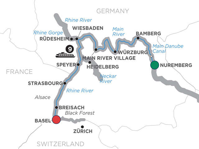 Celebrate this magical time of year with a delightful Christmastime river cruise through the heart of Germany, on the Main Danube Canal, and the Main and Rhine Rivers.Board your ship in Nuremberg, Germany, host to one of the oldest Christmas markets in the country. Get into the holiday spirit as you stroll through the brightly illuminated and decorated Old Town. 200 stalls sell traditional German Christmas wares and seasonal delicacies. In delightful Bamberg, a UNESCO World Heritage Site, you’ll find nativity scenes built by local citizens throughout the town. Learn about holiday traditions as you cruise to Würzburg, and here walk through the halls of the ornate Bishop’s Residenz—home to the largest ceiling fresco ever painted. Then stroll through the Christmas markets while you sip Glühwein (hot mulled wine). Learn how to bake a traditional cookie before arriving at one of the charming small towns with half-timbered houses that are dotted along the Main River. In Rüdesheim on the Rhine River, see Europe’s largest nativity scene with life-size figures. Visit Heidelberg Castle, which towers magnificently over the city, and watch the skaters on the ice rink below. At this time of year, the historic charm of Strasbourg, France, is mixed with festive aromas, sights, and sounds—creating a truly magical atmosphere! Visit the gothic cathedral with its ancient murals and fascinating astronomical clock.Continue your Christmastime river cruise to Breisach, Germany—gateway to the famous Black Forest. An area of unrivaled natural beauty, and the home of Black Forest ham, cherry cake, and cuckoo clocks. There is no better setting at this time of year, when smoke curls from the chimneys of the traditional Black Forest houses. Your delightful holiday cruise ends in Basel, Switzerland.