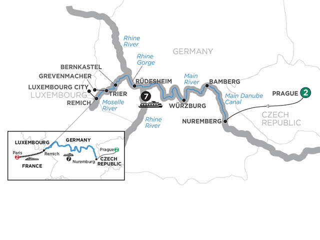 Day 1 Prague: welcome to Czech RepublicDay 2 Prague: guided sightseeing, see the Astronomical Clock and visit Hradčany Castle groundsDay 3 Prague–Nuremberg (Embarkation): travel by motorcoach to Nuremberg, guided tour; onboard welcome receptionDay 4 Bamberg: guided sightseeing, see the Old Town HallDay 5 Würzburg: guided sightseeing, visit the Bishop’s ResidenzDay 6 Main River Village: guided walkDay 7 Rüdesheim–Rhine Gorge: visit Siegfried’s Mechanical Musical Instrument Museum in Rüdesheim; special treat; cruise through the Rhine GorgeDay 8 Bernkastel: guided walk; wine tastingDay 9 Trier: choice of guided city sightseeing or “Roman Trier” sightseeing in Trier, see the Porta NigraDay 10 Remich (Disembarkation)–Paris: transfer by high-speed train to ParisDay 11 Paris: guided sightseeingDay 12 Paris: your vacation ends this morning