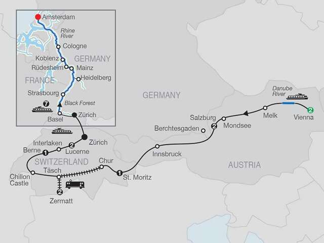 Day 1 Vienna: arrive in Vienna, welcome dinnerDay 2 Vienna: guided sightseeing, visit Schönbrunn Palace and HeldenplatzDay 3 Vienna–Melk–Mondsee–Salzburg: visit the church from The Sound of Music in Mondsee; in Salzburg guided walking tour, visit Mirabell Gardens and the Residenz Square; dinner with the wine at the St. Peter StiftskellerDay 4 Salzburg: day at leisureDay 5 Salzburg–Innsbruck–St. Moritz, Switzerland: walk through the Old Town to the Golden RoofDay 6 St. Moritz–Chur–Täsch–Zermatt: Glacier Express train to ZermattDay 7 Zermatt: day at leisureDay 8 Zermatt–Berne: guided visit of Chillon castleDay 9 Berne–Interlaken–Lucerne: guided walking tour in Berne, stop at the Rose Garden and the Bear Park, take pictures of the Jungfrau massifDay 10 Lucerne: walking tour, private cruise with a drink and farewell dinner at a local restaurantDay 11 Zürich–Transfer to Basel (Embarkation): onboard welcome receptionDay 12 Breisach. Excursion to the Black Forest: visit a woodcarver’s workshop or visit a Black Forest open-air museumDay 13 Strasbourg: guided sightseeing, visit La Petite France district and the gothic cathedralDay 14 Excursion to Heidelberg–Mainz: guided visit of the castle, see the Great Vat in Heidelberg; visit the Gutenberg Museum in MainzDay 15 Rüdesheim–Rhine Gorge–Koblenz: visit Siegfried’s Mechanical Musical Instrument Museum in Rüdesheim and enjoy a special treat; cruise through the Rhine Gorge; guided walk in KoblenzDay 16 Cologne: choice of guided city walk or Jewish Heritage walkDay 17 Amsterdam: canal cruiseDay 18 Amsterdam (Disembarkation): your vacation ends this morning